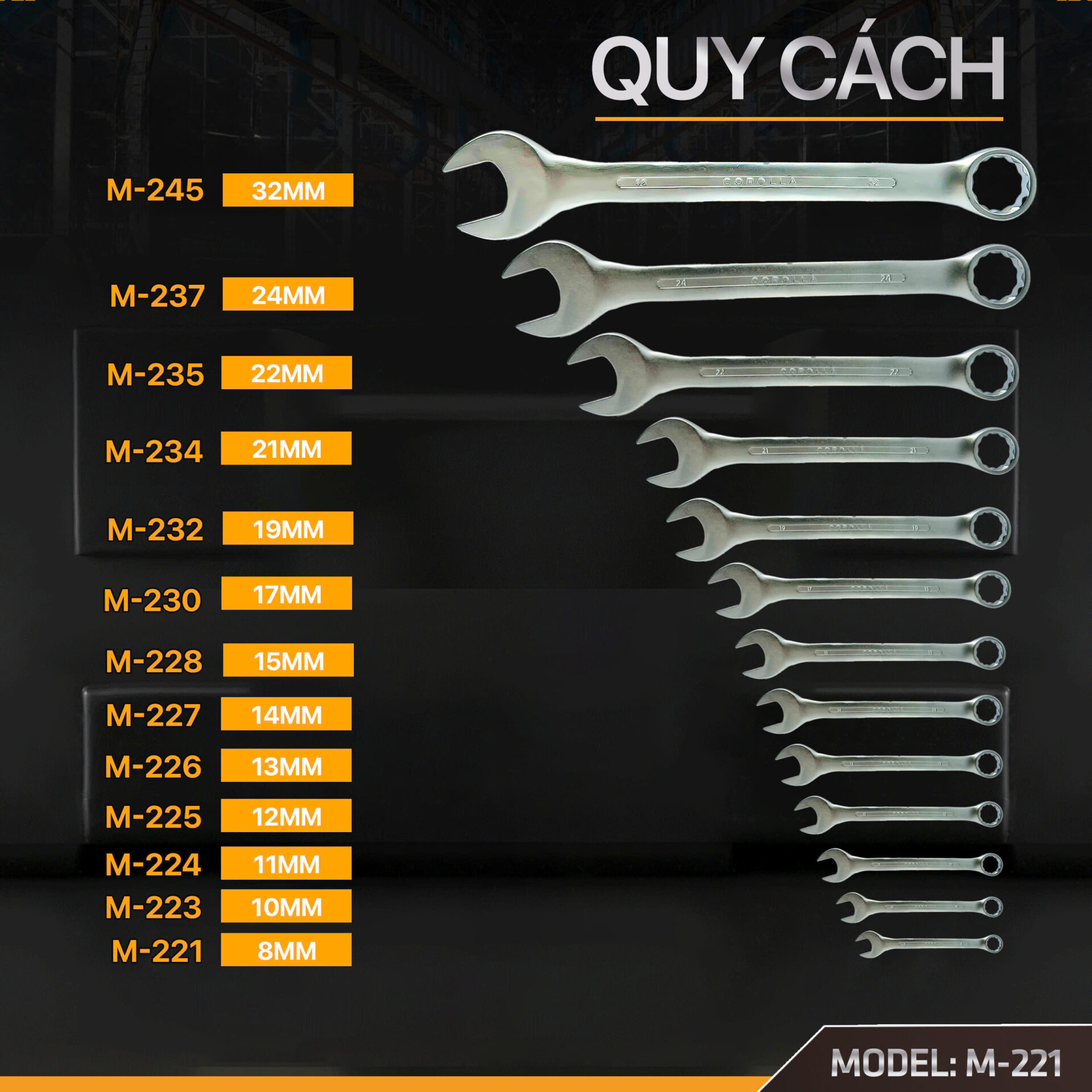 Sản phẩm bao gồm các số từ: 8mm, 10mm, 11mm, 12mm, 13mm, 14mm, 15mm, 17mm, 19mm, 21mm, 22mm, 24mm, 32mm.