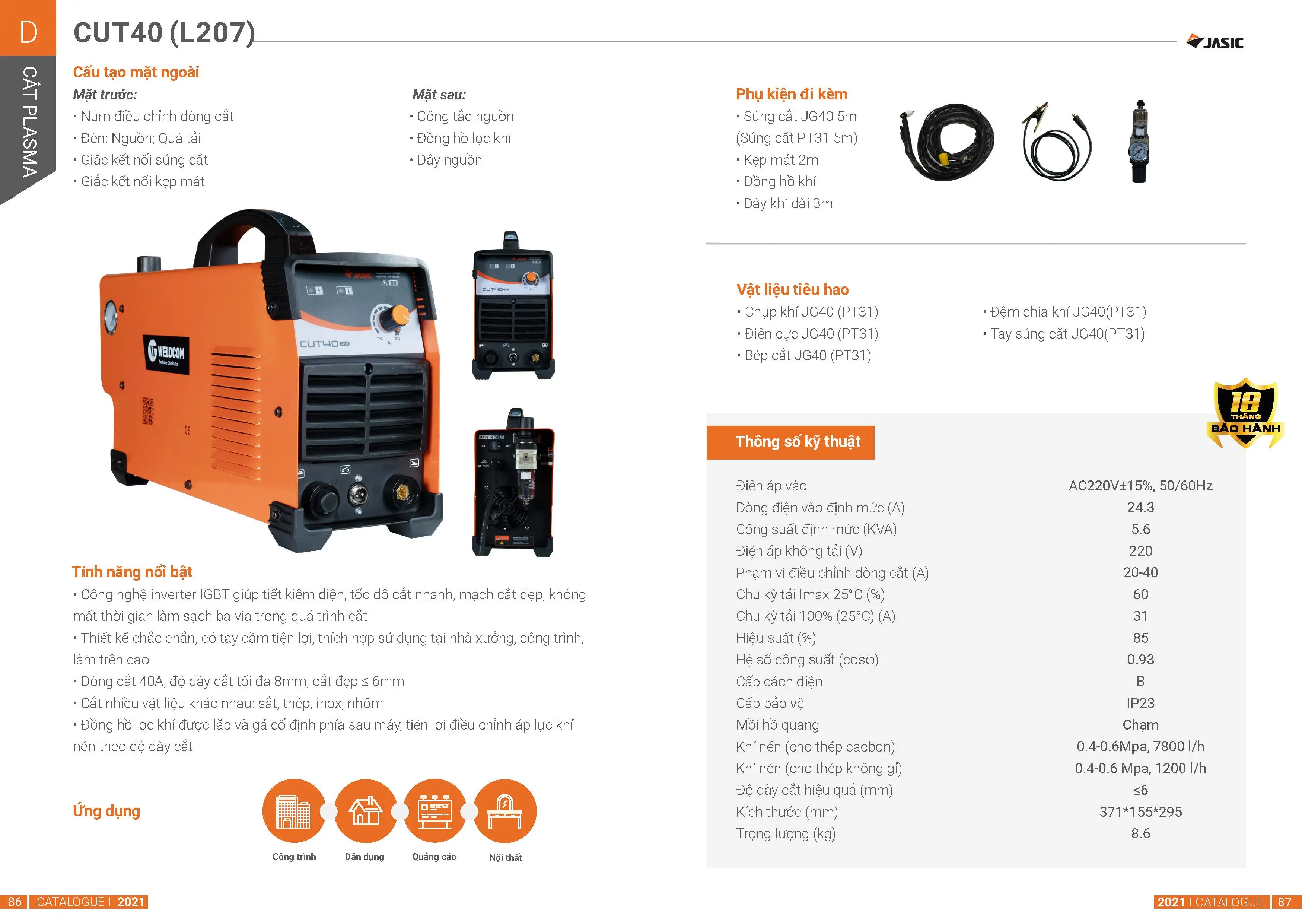 • Máy Cắt Plasma Jasic CUT 40 L207 là dòng máy cắt với công nghệ mới IGBT, được sản xuất theo tiêu chuẩn Châu Âu (CE), giúp tăng năng suất và hiệu quả làm việc