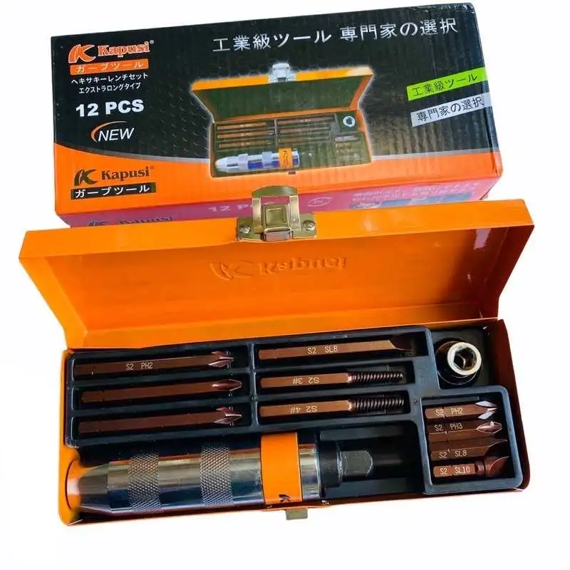 - Bộ vít đóng Kapusi Japan 12 chi tiết chuyên dụng để đóng, mở các loại đầu ốc vít, bu lông tự động mà không cần vặn ốc vít thủ công, lãng phí sức lực và thời gian. Bạn có thể dùng lực xoắn cực mạnh của dụng cụ để mở những loại vít lâu ngày không mở.