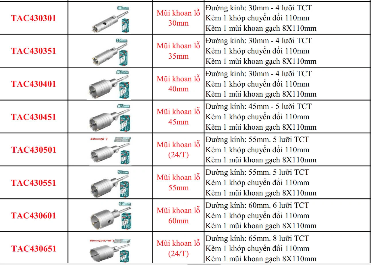 - Mũi klhoan lỗ từ 30mm đến 150mm